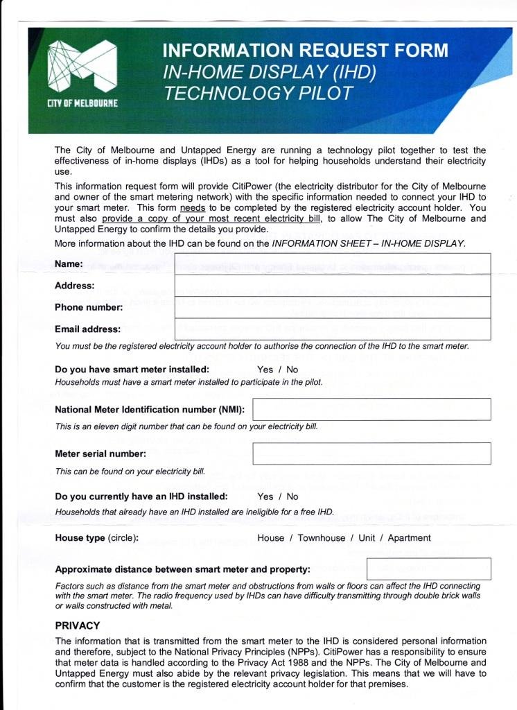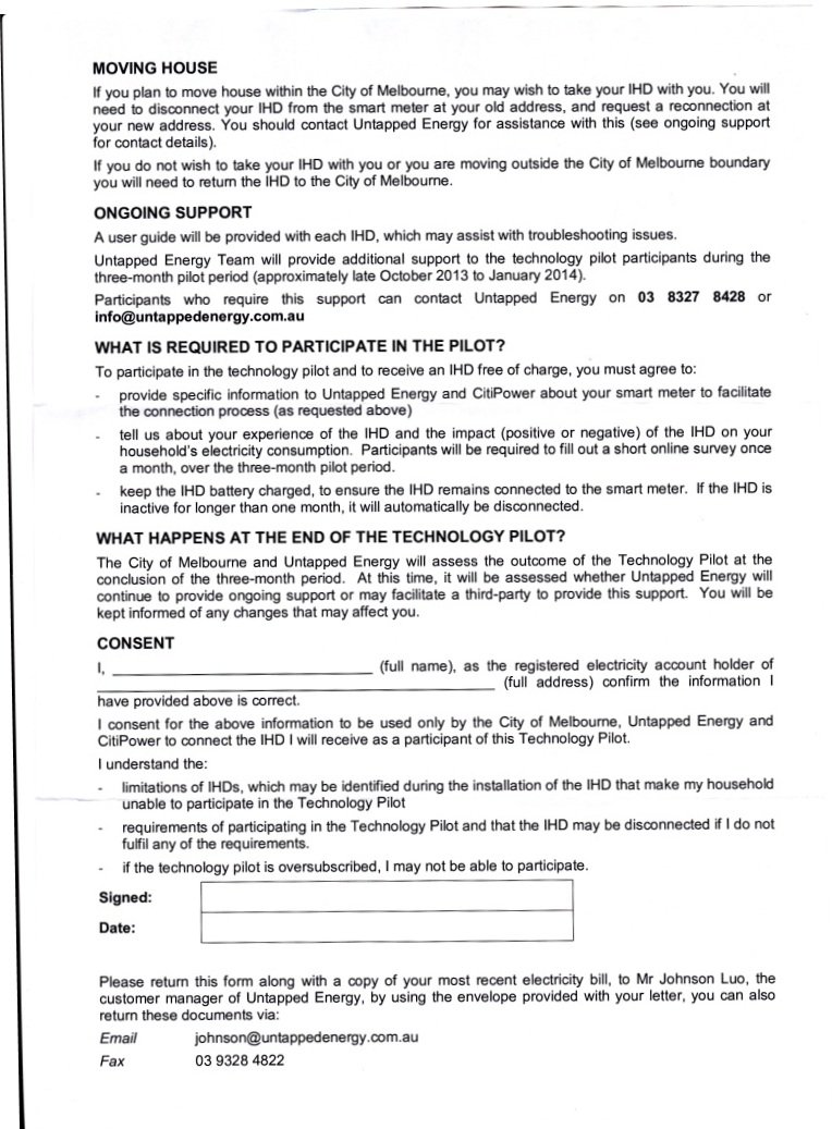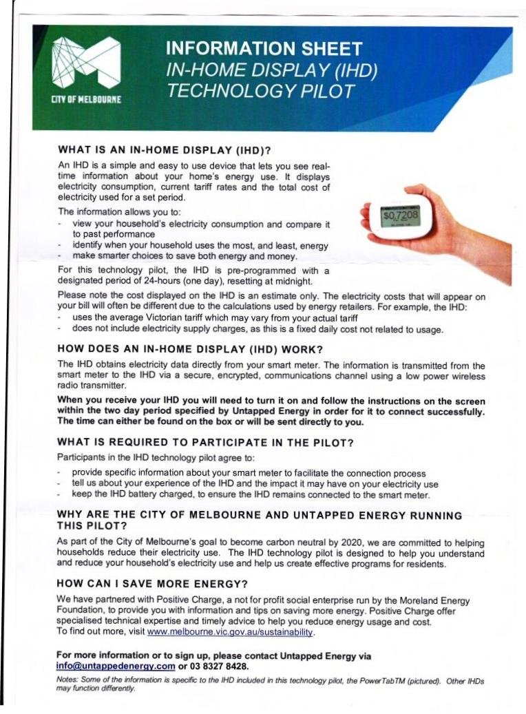 The pilot program involves arranging for In-Home Display (IHD) devices to be placed inside residential households. The devices display real-time electricity consumption data for the household. This pilot program seeks to understand what impact access to real-time data has on household electricity consumption and behaviours.