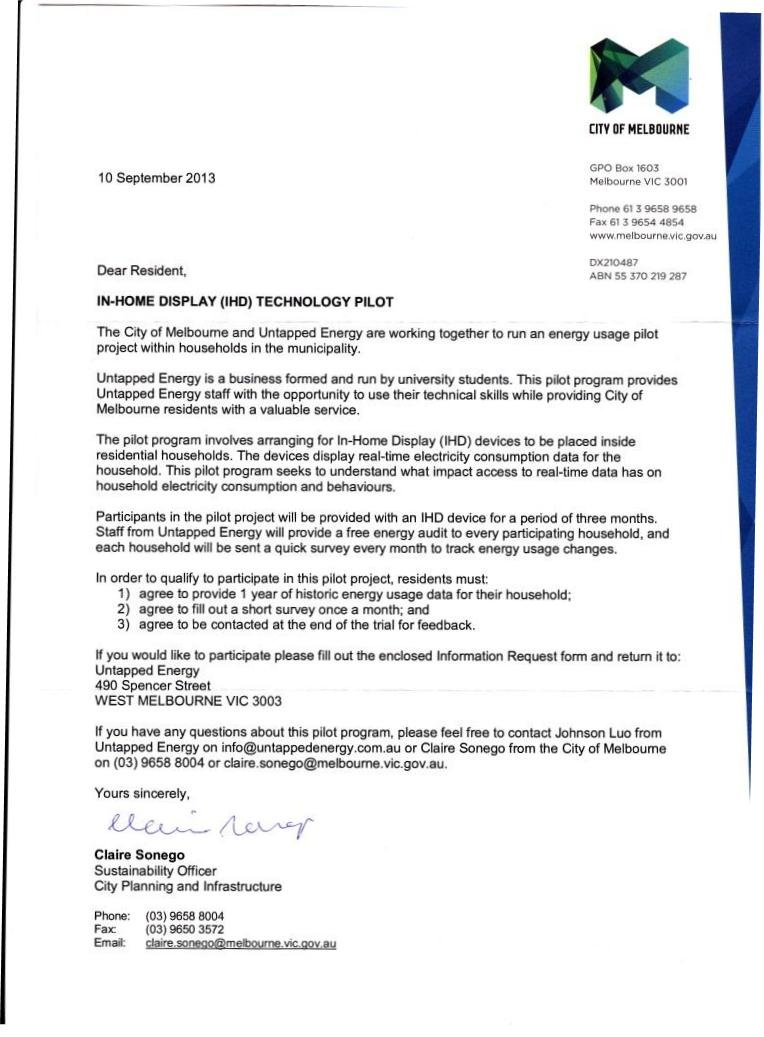 Untapped Energy is a business formed and run by university students. This pilot program provides Untapped Energy staff with the opportunity to use their technical skills while providing City of Melbourne residents with a valuable service.